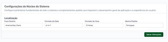 As Configurações do Nùcleo do Sistema permitem que os administradores configurem parâmetros essenciais que afetam todo o aplicativo. Isso inclui localização, formatação de data/hora e preferências de idioma — todos influenciando diretamente a forma como os usuários interagem com o sistema globalmente.