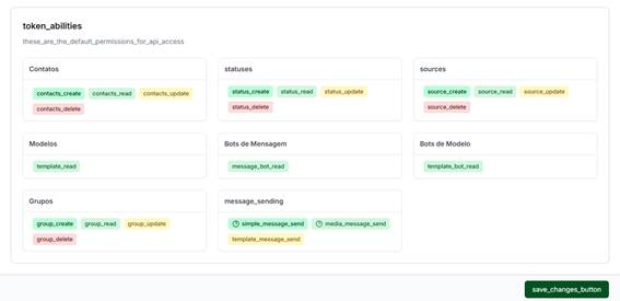 As permissões definem quais ações o token da API pode executar. Ajuste cuidadosamente para garantir segurança e funcionalidade.