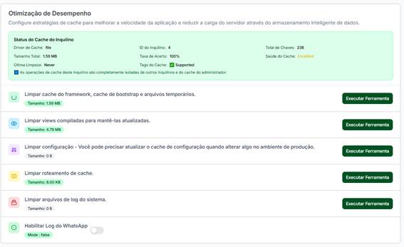 O painel Otimização de Desempenho permite que os administradores gerenciem os dados armazenados em cache que se acumulam ao longo do tempo. O cache melhora a velocidade e reduz a carga do servidor, mas caches desatualizados ou corrompidos podem causar problemas. Este painel fornece ferramentas para limpar caches específicos para desempenho, solução de problemas e renderização precisa de dados. Use estas ferramentas quando fizer atualizações, alterar rotas/visões/configurações ou notar lentidão/comportamento estranho.