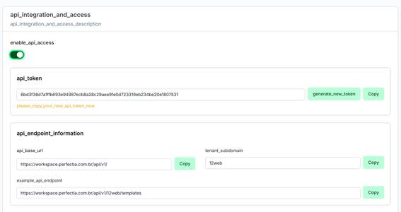 3. Copie a URL base da APICopie a URL base para chamadas de API, geralmente: https://workspace.perfectia.com.br/api/v1/