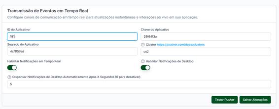 4. Na plataforma, acesse: System Settings > Pusher > Real-Time Event Broadcasting.
